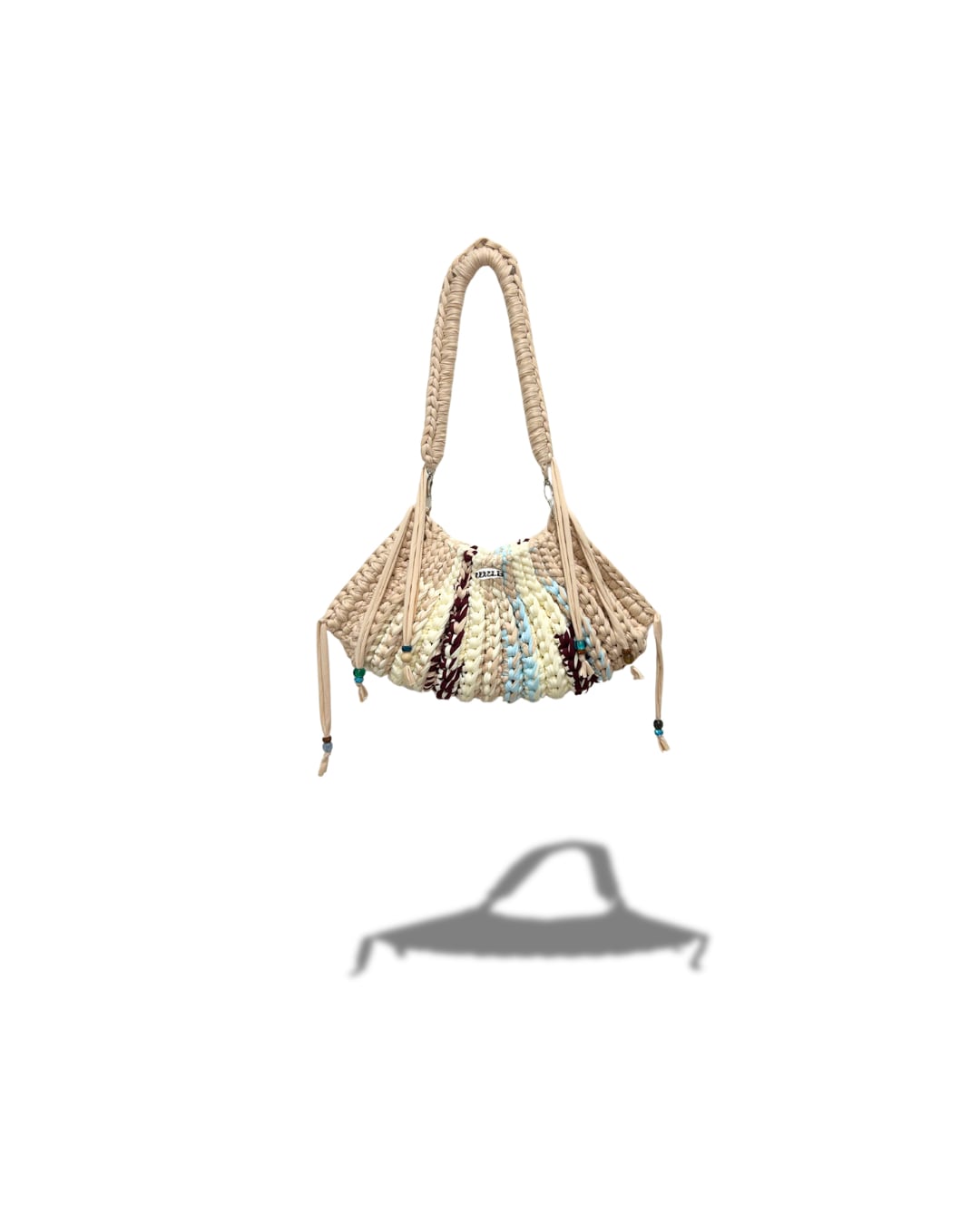 Tシャツを再利用してつくられたTシャツヤーンを使って、ひとつひとつ丁寧に編み上げました。