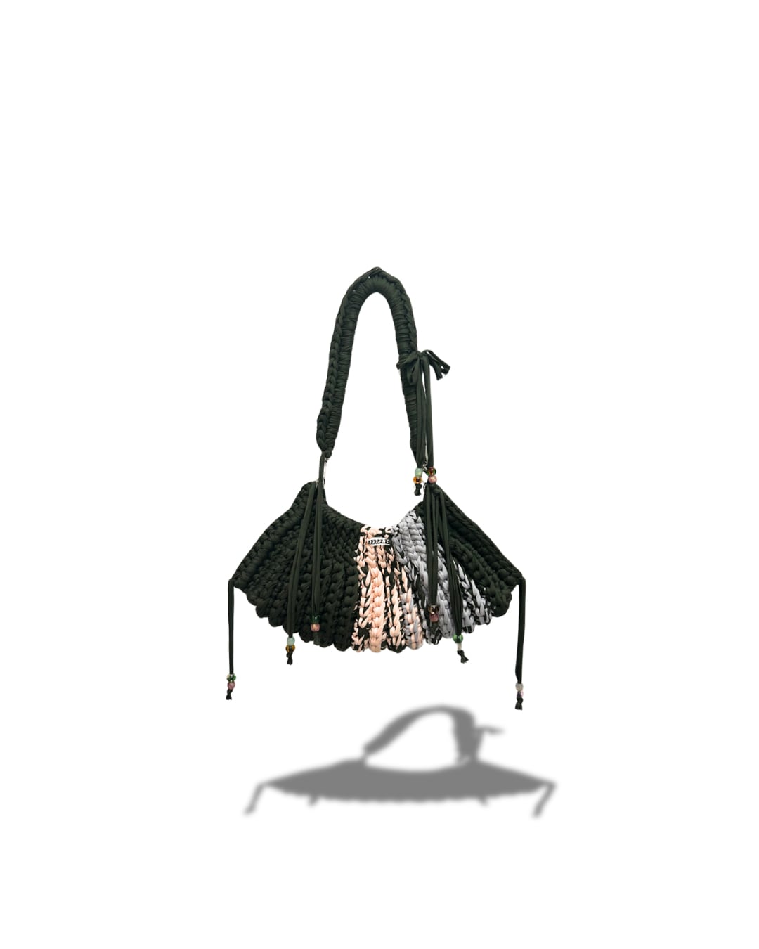 Tシャツを再利用してつくられたTシャツヤーンを使って、ひとつひとつ丁寧に編み上げました。