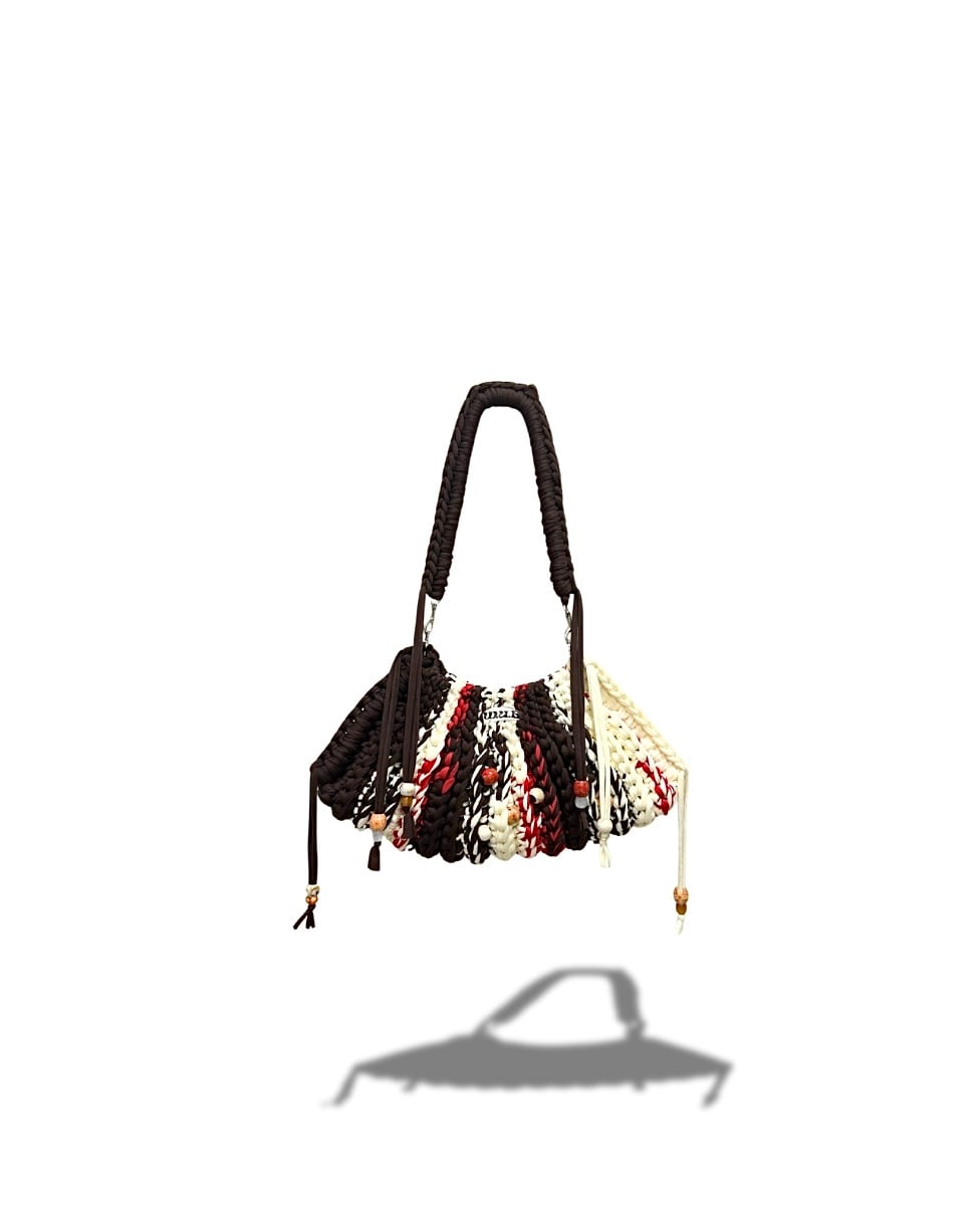 Tシャツを再利用してつくられたTシャツヤーンを使って、ひとつひとつ丁寧に編み上げました。