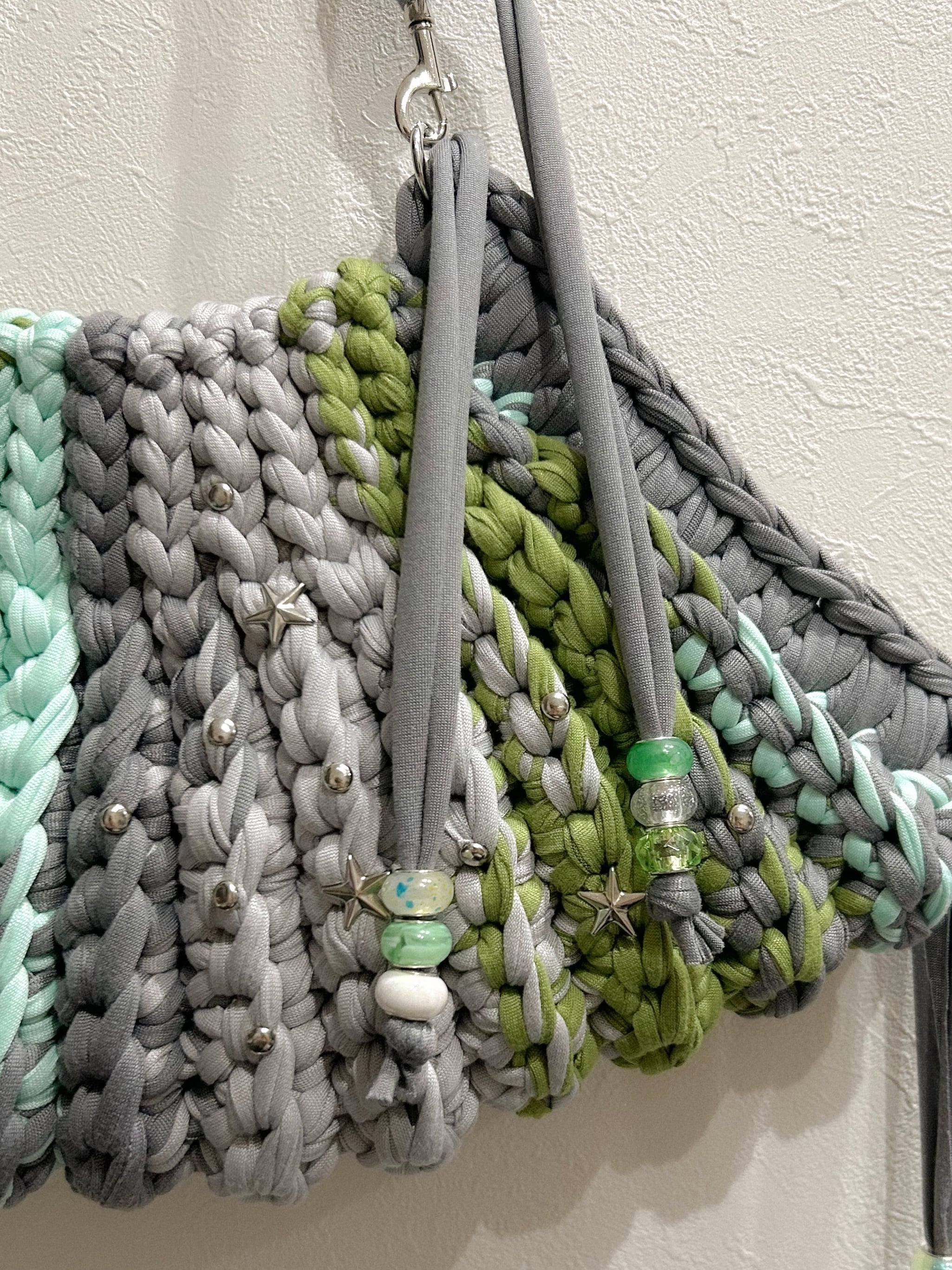 Tシャツを再利用して作られたTシャツヤーンを使用し、ひとつひとつ丁寧に編み上げました。